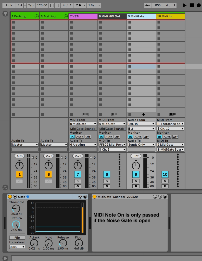 | Description: | TL;DR "MIDI Note On is only passed if the Noise Gate is open". About the name? Watergate, Partygate, and now the MidiGate Scandal. This is a MIDI note gate, that also takes a gated audio signal as parallel input --If there is audio input AND a new MIDI Note-on signal at the same time, then original 'velocity' parameter passes through --If there is no audio input, then the 'velocity' is changed to 0, i.e. Note-on is changed to Note-off. I am using this with the incredible Industrial Radio MIDI Bass system. My purpose is to avoid spurious MIDI note triggering, due to my heavy-handed technique. But I can also imagine that there could be other uses for this type of device, like for instance vocal triggered sequencers. Simple workflow description from right to left, following the track numbers in below screenshot (A-string): --Track 10: MIDI for a specific string is used (channel 12 in my configuration). MIDI is then routed to Track 9 --Track 9: Firstly audio for the string is taken (Ext in 3 for me). The built-in Ableton audio noise gate is then used. Finally I have placed the new M4L device. Open the device in Max if you are interested in the low level details. --Track 8: Example hardware output if you are still stuck in the 1980s :-P. MIDI is taken from Track 9. --Track 7: A simple VSTi track (using the excellent and free CollaB3). MIDI is taken from Track 9, and Audio is passed to the top Track 6 --Track 6: This is the top track in the group, allowing easy copy+paste for each string. Audio from Track 7 is just passed to the Master bus. |