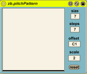 | Description: | zb.pitchPattern changes the pitch of the incoming notes according to the graph. The vertical axis of the graph represents pitch. The steps of the graph determine the amount of available pitches. The lowest value will correspond to the pitch of the offset parameter. Further bars will represent higher pitches based on on the scale multiplier. In the example above one step on the graph corresponds to two semitones. The reset button allows for restarting the pattern at an arbitrary point in time. The length of the pattern i.e. the amount of bars can be chosen with the size parameter. |