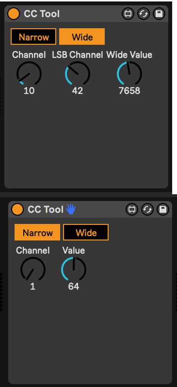 | Description: | CC Tool is a Max For Live MIDI effect which allows MIDI CC values to be set and automated from the arrangement view (live only has native support for setting these values from midi clips) The tool has two views, narrow and wide. In narrow view, the range of the value dial is 0-127. MIDI CC messages will be sent to the selected channel In wide view, the range of the value dial is 0-16383. MIDI CC messages for the MSB will be sent to the channel selected with the Channel dial while CC messages for the LSB will be sent to the channel selected with the LSB Channel dial. When the tool is in narrow view, input to the Wide Value dial will be ignored. Conversely when the tool is in wide view, input to the Value dial will be ignored. The tool will pass through any MIDI CC messages to channels other than those it is configured to use, so multiple instances of the tool can be used to control multiple CC channels. Incoming MIDI CC messages on the configured channel are ignored. A demo project showing the device in use (with the device embedded in it) can be downloaded at the provided URL |