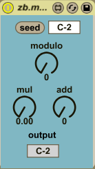 | Description: | Two basic recursive algorithms are zb.moduloRecursion and zb.logistic They both alter the pitch of incoming notes. The zb.logistic device implements the logistic equation that has a single coefficient that drives the system from fixed value through oscillatory into chaotic behaviour. Both devices have mul and add parameters to fix the output range, also they can be reseeded at any moment using the seed buttons which will restart the recursion with the specified value. Gray output boxes are used for display purposes. |