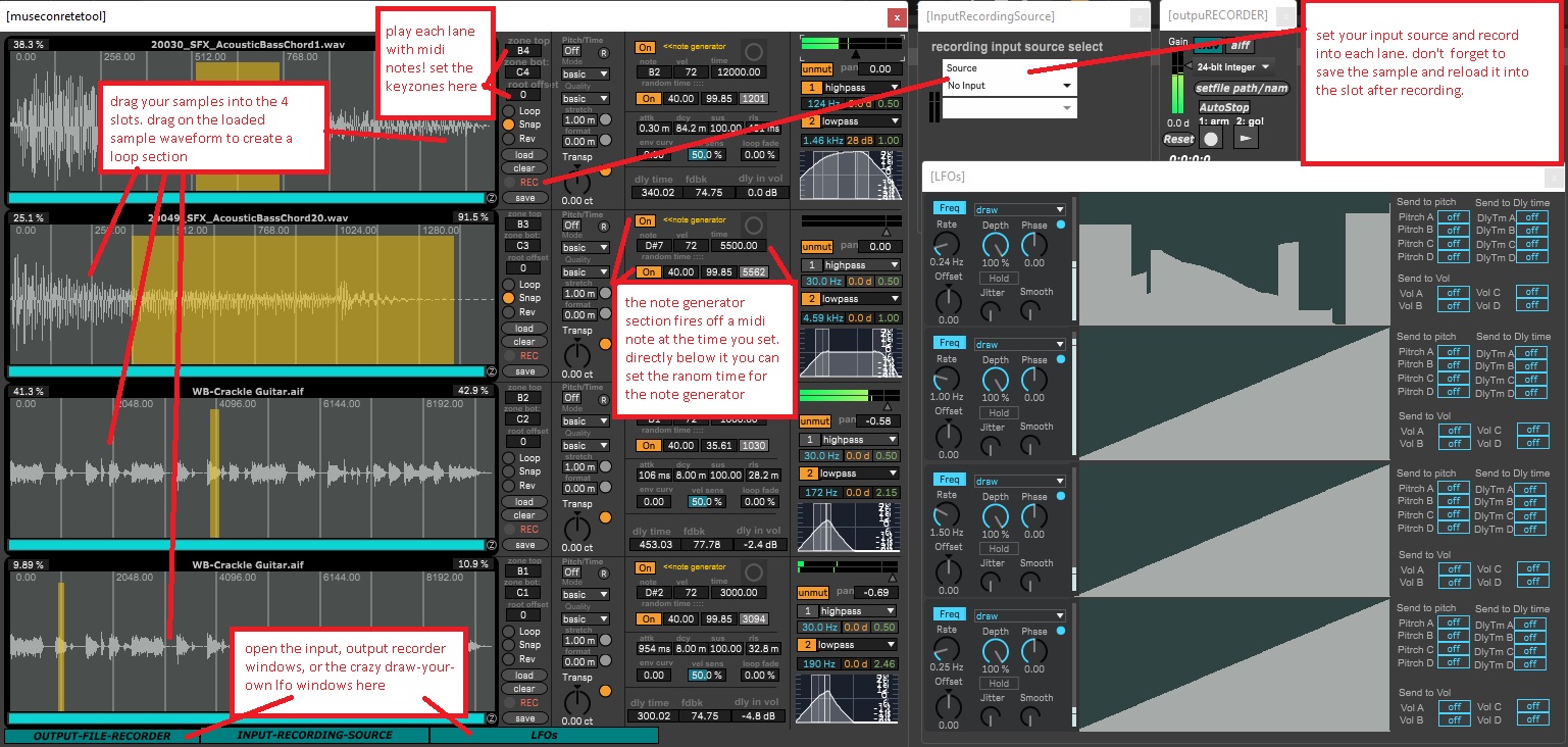 | Description: | v1.2 ~ added probability option to both incoming midi notes as well as the auto note generator. added a 'midi note plays sample offset' feature(experimental). added a better reverb in the master fx section*. bunch of little fixes and improvements. this vid shows a demonstration of the new features: https://www.youtube.com/watch?v=Zn5LA1tbfhI v1.1 ~ added generic step sequencer, added mstr output fx (freeverb>limiter), added mstr audio out to lane recording, added ability to send lanes' audio to separate tracks in ableton (full stereo=1/2, laneA=3/4, laneB=5,6 etc), fixed window close/open bug v1.0 ~ i needed a tool that would help me quickly sketch with and build basic experimental or ambient songs out of all these vinyl, tape, radio, and field recording samples i've captured over the years. and also allow me to make rhythms and or crazy textures if needed. through the process of making and exploring with this tool, i realized it can do a whole lot more. and is even useful for live performances. especially when you play midi notes into it. it can then be useful for just about any genre. you can build pads, make beats, etc. i didn't initially think to share it but a friend mentioned other's might find it useful too... hope it provides the community some inspirations! basic use instructions (see the screenshot image): you can drag+drop or even record audio into each of the 4 samplers. then click+drag on a samples' waveform to make a loop section. you can play midi notes (polyphony) into this or let the auto note generators (turned on by default so you can immediately hear the samples) make off grid sequences for you. if you record into the lanes - DONT FORGET TO SAVE THEN DRAG THE FILE FROM THE BROWSER BACK INTO THE LANE so that when you reload the ableton project, everything will be as you left it. here's a demo video showing most of the basic functions. in the description there you can also download some demo projects i threw together while making the video that use this tool so you can observe some different ways to make use of it: https://www.youtube.com/watch?v=U78exwFJp1I let me know of any bugs you run across, im sure there are plenty. also the keyboard zone filter section is a bit odd.. the bottom note always starts at c3(you can further offset that with the root shift numbox). i might change it to behave like a more traditional keyboard zone/note filtering system. also want to add multiple outputs so you can route each lane into a separate track for further process in live. and of course some kinds of internal sequencers. shout out to the following devs of these amazing m4l patches that i utilized to make the muse concrete tool tick: more simpler frz 2.0 by maxforlive.com user frz:: https://maxforlive.com/library/device/7344/more-simpler-frz-v2 lfodraw 1.0 by maxforlive.com user delicateear:: https://maxforlive.com/library/device/3331/lfodraw quick record 1.0 by maxforlive.com user natecraypo https://maxforlive.com/library/device/6163/quick-recorder floating window code by cycling 74 max msp forum user PID https://cycling74.com/forums/floating-window-2?replyPage=1 lovely reverb in master fx section by remo de vico: https://www.remodevicocomposer.eu/ also the core paradigm of this tool was inspired by the quad chaos m4l instrument by pheek and Armando Gonzalez Sosto (although no code or subpatches from quad chaos were used): https://audioservices.studio/product/quad-chaos there's also a standalone app of this: win - https://tinyurl.com/5n922wxh osx - https://tinyurl.com/2n4tsam4 https://www.youtube.com/watch?v=TxfNaICei18 - a video showing the windows standalone https://www.youtube.com/watch?v=dcX6PYo1KQ4 - video taking the OSX standalone for a spin |