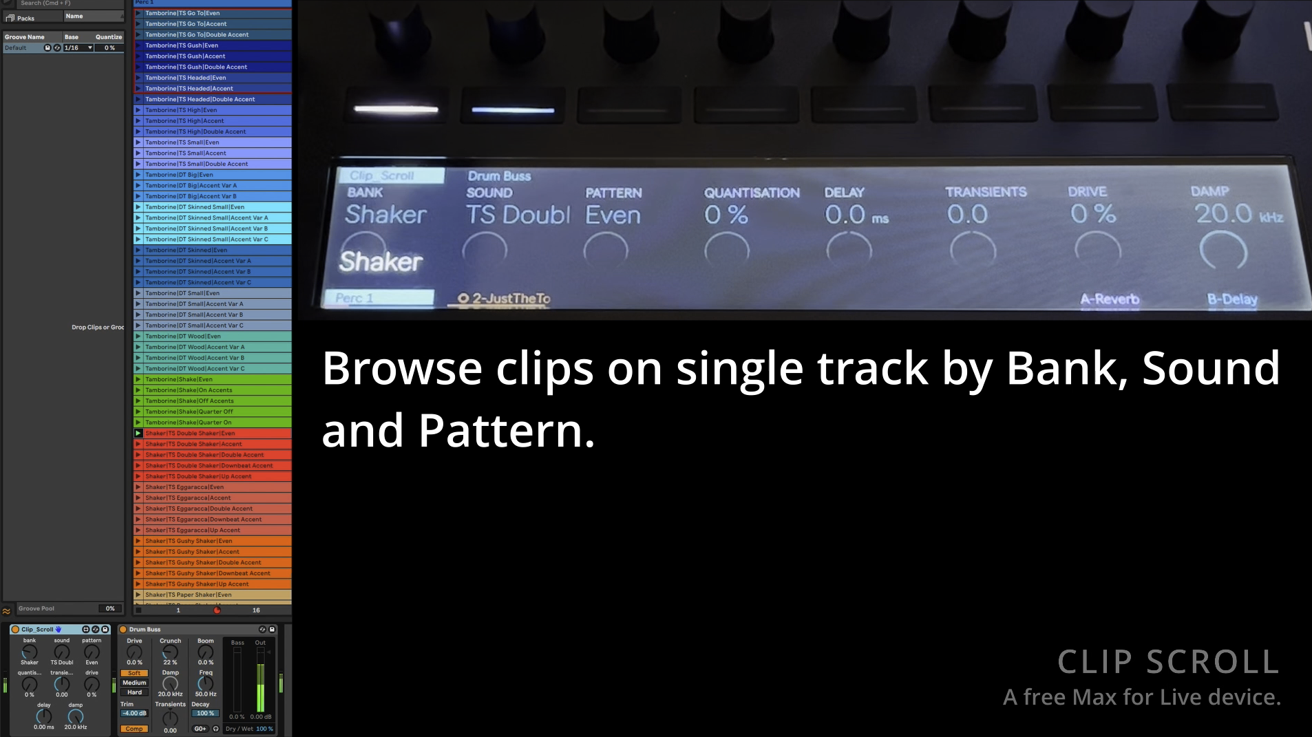 | Description: | Clip Scroll is a device designed to allow easy browsing from Push of a track filled with audio loops. While the workflow is probably too specific to my setup to be useful as is, I think the technique used to do dynamic text parameters on the Push might be of interest, and it would be easy to remove/change the bits you don't want to use if you just like the browser itself. The motivation for doing this is I wanted quick access in a live set to a curated list of loops, but also wanted to be able to use Ableton grooves. This ruled out the use of Simpler for example. Please watch the linked youtube demo for a better idea of how it works. Requirements to use the device: - You need all of your loops as clips in a single audio track. - Each clip must be named as bankname|soundname|patternname (with the pipe character as a separator). - You cannot use any numerical characters! - Clip Scroll should be the first device in the track, followed by Ableton Drum Buss (which will be automatically linked to Clip Scroll). - The clips should all have the same groove applied from the groove pool (if you want to use the quantise feature). |