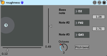 | Description: | A Max4Live MIDI effect that creates chords using an X/Y pad control. Check out the demo: https://www.facebook.com/640858200/videos/10157921685208201/ The first (bass) note is read from the MIDI clip that is active on the device's track. Then by moving the X and Y controls you are changing the frequencies of the second and third note of the chord. The device translates the X/Y frequencies into notes and you get a (bass, note(X), note(Y)) chord. Certain X/Y positions will produce consonant chords, others will result in dissonant chords. The notes are displayed together with the frequency ratios between X:bass and Y:X. Using the ratios one can figure out the chord type. For example, major chords have ratios of 1.25 and 1.2, respectively. There's an Octaves control which sets the limit of the frequency field: the more octaves, the higher notes will the device produce. There's also a toggle for switching MIDI pitch bend on and off. With the toggle on the device uses pitch bend to smoothly "glide" through the frequency intervals between discrete notes. With the toggle off, the pitch bend is not used. The X/Y and the Octaves controls are suitable for automation, for example using LFO MIDI as the input. That way this device can be used to generate chords automatically. You can run the output through Ableton's Scale device to make sure the notes fit a specific key. Inspired by Sebastian J. Schlecht's On Musical Dissonance: https://www.sebastianjiroschlecht.com/post/ondissonance/ |