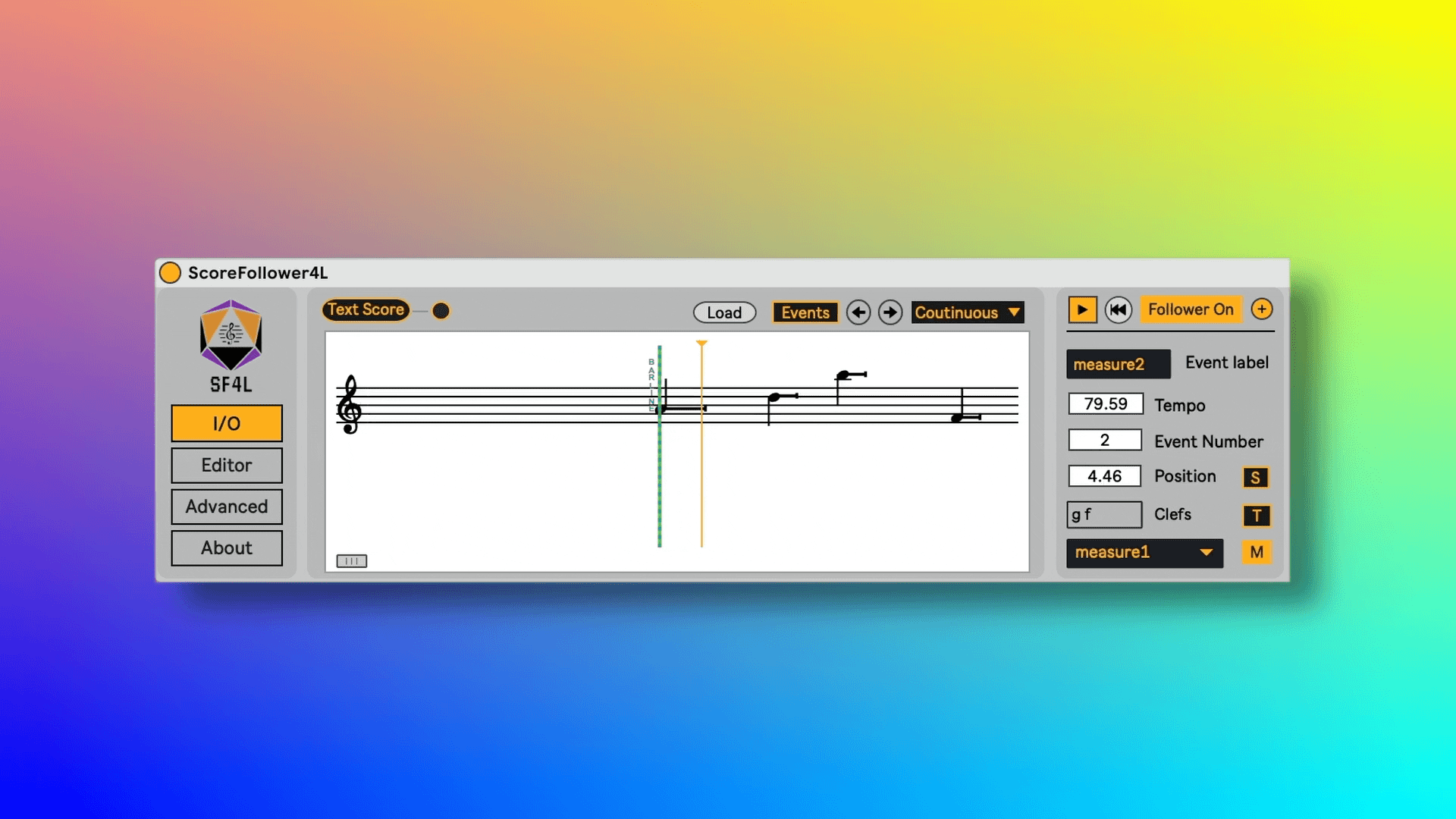 | Description: | With ScoreFollower4L, you can let Live follow your playing without having to worry about triggering events or aligning to a click-track. Ideal for live music performances using backup tracks, live electronics, improvisation, or music that requires any live triggering. Advanced Score Follower for Ableton Live. Demo: https://youtu.be/-MrDAuWy7LU Full documentation: forum.ircam.fr/projects/detail/scorefollower4l |