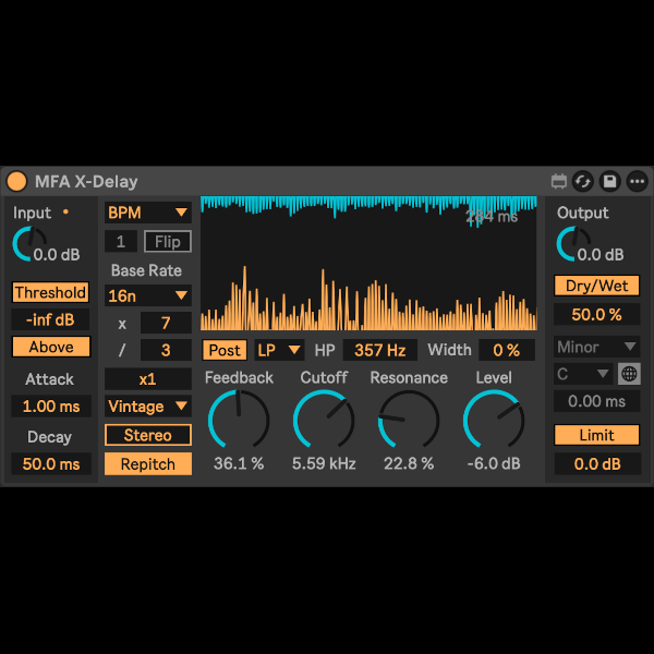 | Description: | Creative Echo Designer: Echoes fade beyond the distance: memories of the past carried into the future. Crafting rhythmically flexible space and depth, X-Delay is designed by Ableton Certified Trainer Noah Pred to add a sense of movement and momentum to any sound with extreme feedback that can transport the listener to distant realms. X-Delay excels at adding drama and tension to any material, whether it's a driving riff, a pulsing beat, or even a simple chord stab. With its ability to create vast, ethereal soundscapes via MIDI input with flexible delay times, powerful filtration, and three selectable circuits, X-Delay is the perfect tool to expand the space of your productions. X-Delay is optimized for Push with full Info View annotations for further details; just hover the mouse over any parameter to view detailed information on all controls in Live’s Info View. NEW IN v2 Three Delay Cicuits: Modern, Vintage, or Classic Ping-Pong and Repitch Options Direct MIDI Input Mode Octave or Half/Double-Time Control Dedicated Separate High-Pass Filter Circuit Redesigned GUI & Numerous Enhancements NEW IN v2.1 Now features an optional delay time quantization option to quantize delay times transposed via MIDI or X-Relay to the nearest selected timing interval (ie., 16n, 8nd, 32nt, etc.) MIDI mode now offers a flip option Already comes included in: X-FX. |