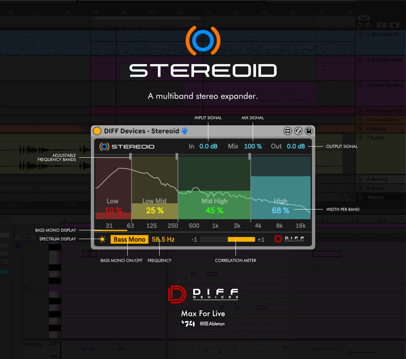 | Description: | STEREOID is an impressive Max for Live device to precisely adjust stereo width on your tracks or your master. FEATURES 1.0: • Stereo Width per band ( 4 bands ) • Adjustable Frequency bands • Bass Mono On/Off • Spectrum display • Correlation Meter • Mix Signal • GUI match Ableton Live Themes INSTALATION & USAGE GUIDE Inside the zip file you have an file : 1. DIFF Devices - Stereoid.amxd 2. Save the .amxd file anywhere on your computer or in a folder that you previously saved your maxforlive devices. 3. Drag and drop the device into a midi track. 4. Click on save (on the right hand side of the window: with a 'floppy disk' icon)... (Check Manual.) 5. This will automatically save the device to your ‘User Library’ folder in ‘Places’ (the ‘head outline’ icon), and will also save a '.adv' file which can be used to store your favourite initial setup. 6. Map “Open” button to your keyboard and/or midi controller. 7. You’re good to go. SYSTEM REQUIREMENTS • MAC & WIN * Only works in Ableton Live with Max installed. * It Requires Ableton Live V11 (minimum). * M1 Mac Compatible. |