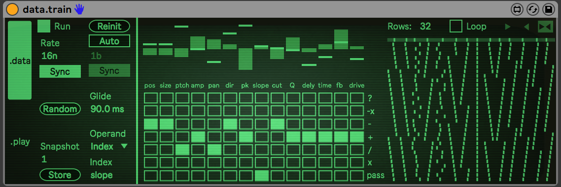 | Description: | data.train is a sampler mangler of sorts that can be used as an audio effect or instrument (works with dropped samples or live audio input). It centers around the modulation of sample playback and FX through a grid of math operators. Each playback and FX parameter has its own modulation source/value and each frame that value changes based on its selected math operator. By changing the operators in a chain of events and the source of their right-hand operand, you can create complex to harmonic oscillations that can be evolving over time or repeating rhythms. This device is great for many uses, especially for rhythmic effects, glitchy/chaotic/stuttering sounds, ambient/generative soundscapes, pretty effects, or adding a bit of weirdness to your sound. Teaser: https://www.youtube.com/watch?v=lheE9aMeeSU&feature=youtu.be Walkthrough: https://www.youtube.com/watch?v=pQ3KI_nGDqU MORE STUFF: dillonbastan.com |