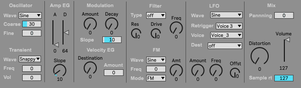 | Description: | Based on "LXR drum 1-3 editor" by user dru93 This midi device allows you to edit Voice 3 parameters on LXR 01 drum machines running the standard Sonic Potions Firmware (Tested on version 0.37). This device uses both the CC and NRPN parameters. Unfortunately, the standard Sonic Potions firmware uses Midi CC 132 for the "LFO Amount" parameter for Voice 2. This is a reserved CC number used for Global "Note Off" commands and is used in a number of DAWs including Ableton. Ableton continually sends a "0" value on this CC for every note and CC event - effectively making the parameter unusable. For this device the LFO from Voice 4 is used as the "standard" LFO to modulate Voice 3 to compensate for the fact that the device for Voice 2 "borrows" the LFO from Voice 3. Subsequent LXR voice devices in this series will "borrow" the LFO from the next voice to account for this. This does NOT affect the device for Voice 1. Note: The current version of the device doesn't include a menu with explicit values for the Velocity EG Destination. A future version of this device will include an explicit drop-down menu for the destinations. The device scrolls through destinations via the dial. You will need to reference the LXR LCD screen to confirm your modulation destination in the meantime. |