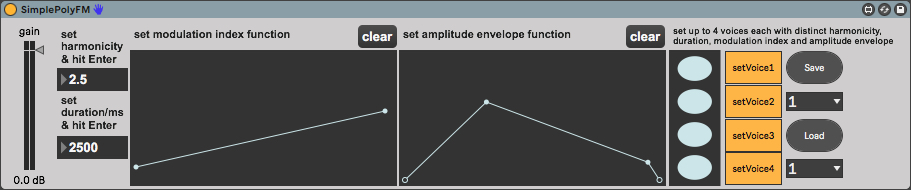 Description: Simple polyphonic digital FM synthesizer utilising the known as "simple" or "Chowning" FM synthesis. You can set up to 4 voices - each one with a distinct duration, harmonicity ratio, modulatin index, and amplitude envelope. Initially based on FM Synthesis Max Tutorial. Leave a comment with your thoughts if you find it useful, please! Have fun with it!