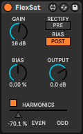 | Description: | A saturation plugin with an Even/Odd harmonic distribution slider. This uses waveshaping techniques for saturation and rectification. I used a tanh() function for the soft clipper, and provided multiple bias points, and rectification taps. It is x4 oversampled so aliasing should be minimal. |
