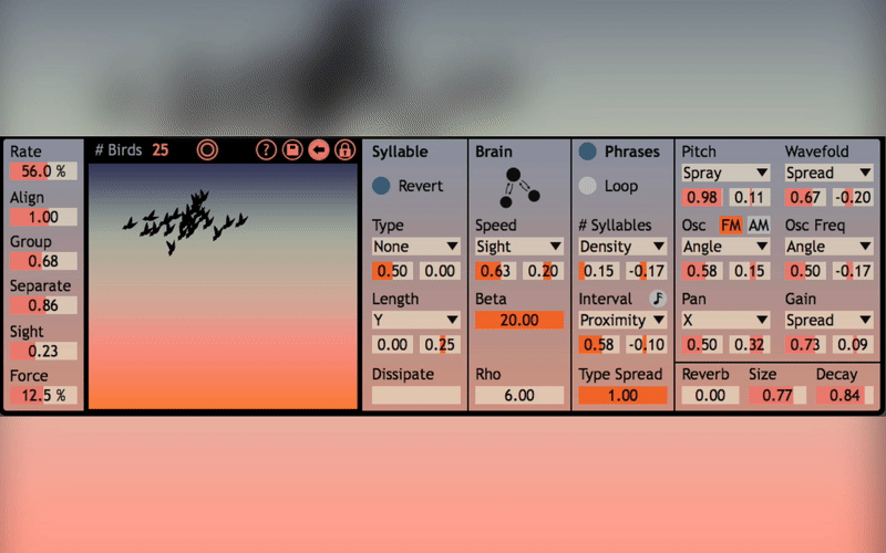 | Description: | Songbird features a simulation of a flock of birds, each bird having its own model of a syrinx (a bird vocal organ) as well as a model of a simple birdbrain that controls the syrinx to create different syllables. Each bird’s position, speed, angle, etc in the flock can be mapped to various parameters as modulation sources. This device yields anything from textures, drones, rhythms, harsh/haunting/noisy/pretty tones, generative soundscapes, odd melodies, and of course different sounding bird calls! Teaser: https://www.youtube.com/watch?v=omA36IR8u4s Walkthrough: https://www.youtube.com/watch?v=31jzK1YOwXY More: dillonbastan.com dillonbastan.com/store |