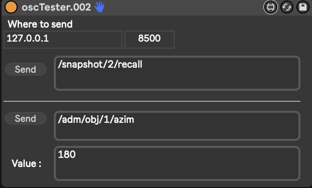 | Description: | oscTester is a max for live patch that send custom OSC message. custom ip / port first send with no value second send message + value 230828 : change the extra arguments with text field min / max custom the value of the second send |