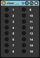 Description: | A simple device that clears all automation / envelope lanes of currently playing clips at the press of a button. Useful if you are live looping and recording parameter changes in overdub mode, but want a quick way to clear them again later. 1.1: individual buttons for tracks 1-16 1.12: fixed missing connector to current clip nr Demo vid in link |