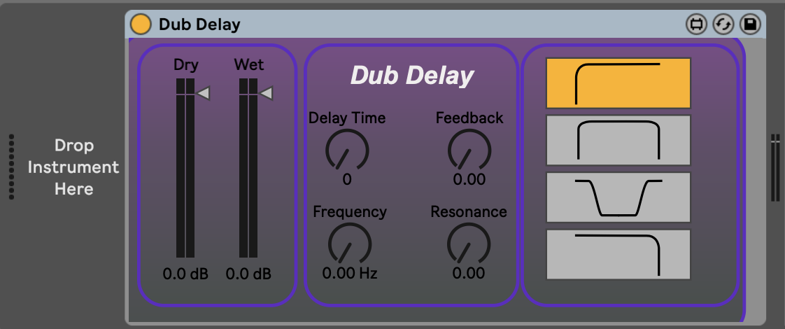 A simple dub delay with filter, resonance and feedback. It is a scaled down version of another patch I created called Dub Delay plus |