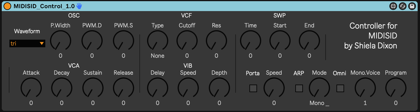 | Description: | MIDISID Control 1.0 By Uriah Findley For controlling MIDISID by Sheila Dixon Includes Push knob mappings Known Issues: MIDISID seems to display strange info when changing the waveforms via MIDI. Only seems to be a display issue, as the waveform sounds change correctly. Some parameters for such and Ring mod have not yet been CC mapped so cannot be controlled. (yet) |