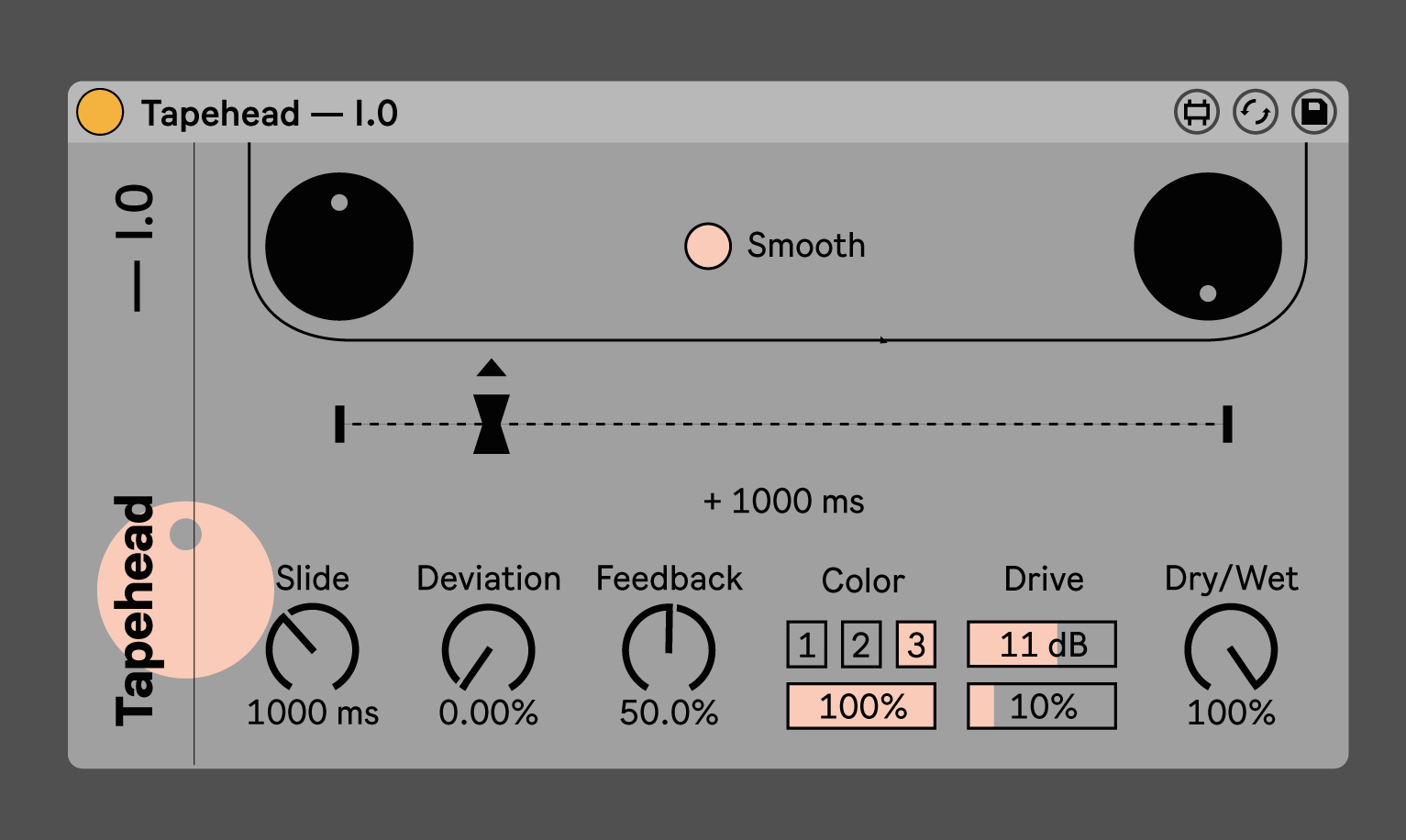 You've accomplished something phenomenally elegant from start-to-finish here. I'm exploring Tapehead — the UI design is tactile and elastic, the hover tips are well-explained, and it actually sounds AWESOME TAPEY GOODNESS. So fun to drag the slider and wiggle it back and forth, can get some turntable scratch-esque effects with that. You even thoughtfully included ways to color it further, so it's tidily self-contained. Having fun with some piano sounds to make all lo-fi.