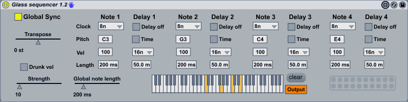 My first post to this wonderful devices collection. A four note tempo driven sequencer reminiscent (to me) of Philip Glass (so... that's why !) or Michael Nyman works. You can choose the notes pitch with the mouse or your midi kbd. Interesting time shifting possibilities with the delay options. For now, you have to change the 'drunk strength' setting to get it to work. Don't know why because there's an argument for the drunk step size... Everything is midi mapable because I like to keep control before trying the random stuff (even if I always end up clicking on it). Thanks to Broc and Chapelier Fou for helping me in splitting the chord from the kbd (damn unpack object...).
