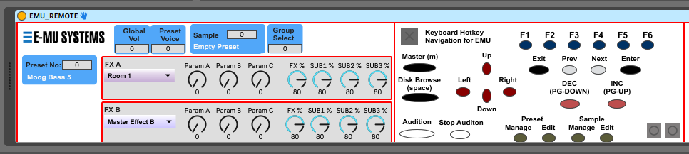| Description: | This MIDI device allows control of E-MU E4 samplers running EOS 4.0 or higher. Features include: 1. Click Preset input field to switch presets with cursor keys 2. Direct control of Master FX A and Master FX B effects type 3. Direct control of FX parameters and sends with automatable knobs 4. Buttons in Ableton to navigate key EMU menus 5. Toggle Keyboard Hotkey Navigation and use hot keys to navigate E-MU menus from Ableton (for example to navigate to load a bank from Disk) Enter -> ENTER ESC -> EXIT Space -> DISK BROWSE m key -> DISK MASTER up/down/left/right key -> up/down/left/right cursor Page down -> DEC Page up -> INC 1 key -> F1 2 key -> F2 3 key -> F3 4 key -> F4 5 key -> F5 6 key -> F6 Notes: On the E-MU hardware side: ensure Midi Device ID in E-MU Master -> Midi -> Mode is set to 1. In Ableton: route the E-MU input via MIDI into your MIDI track and the output of the track to the E-MU. Please the MIDI device onto the track. With multiple samplers, put each E-MU Remote MIDI device on a separate track. Special thanks for inspiration to bcm70. |