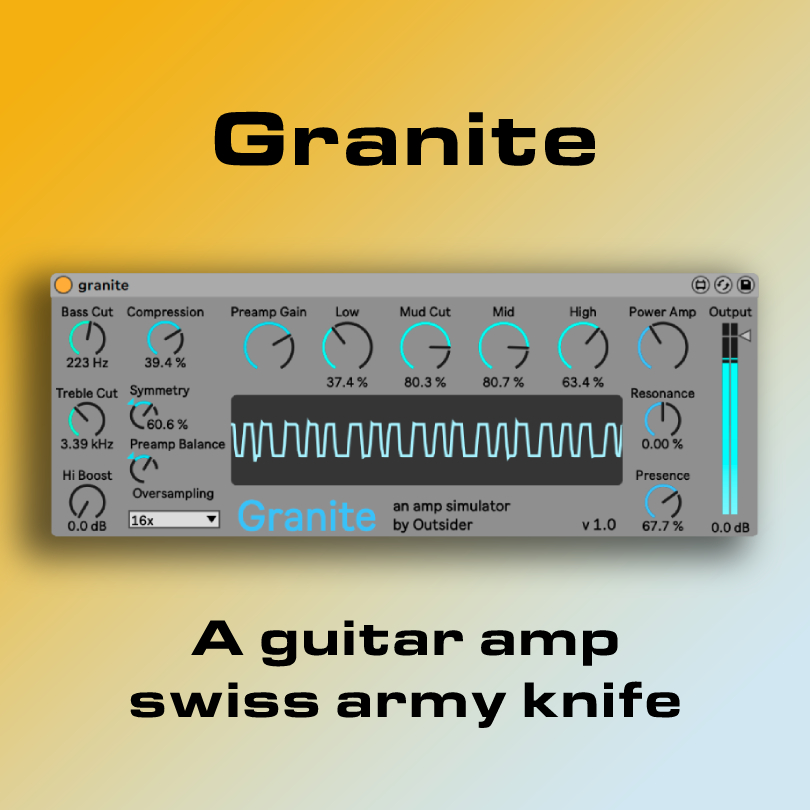 | Description: | Changelog for version 1.1: Added parameter mapping for Ableton Push thanks to ValiumDuPeuple A custom designed guitar amp plugin that can go from glassy boosted cleans to tight modern high gain tones. Granite is my answer to the struggle of getting good guitar sounds out of Ableton's Amp plugin! It shouldn't be so hard! It features: Up to 16x oversampling Input filtering to shape the low and high end response of the preamp Control over multiple preamp gain characteristics to tweak the subtleties of your tone A custom 4-band EQ design with aggressive but balanced midrange, a bass knob that can give you all out fuzz, biting treble and a unique "Mud Cut" to clear up the low midrange A power amp saturation section with smooth presence and beefy resonance controls Another powerful tool in your tone arsenal! |