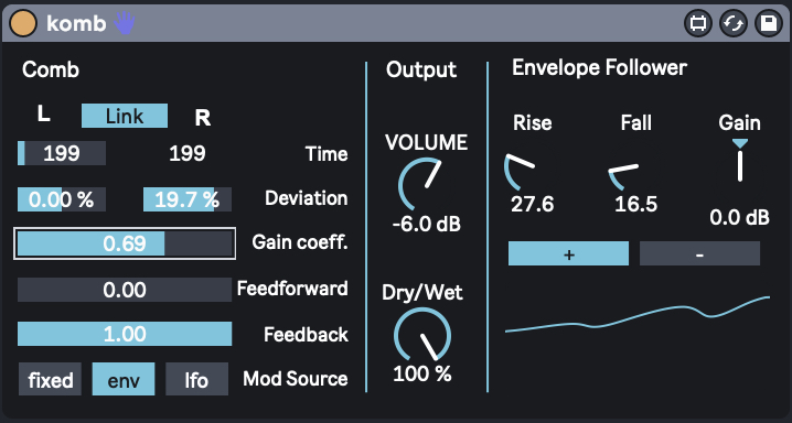 | Description: | komb is a stereo comb filter that can be modulated by an internal LFO or an envelope follower. The tempo of the two channels can be set independently or they can be linked. If linked is possible to adjust tempo deviation for each channel. If gain coefficient is set to the same value as feedforward the signal is dry. Feedback controls the presence of the effect. |
