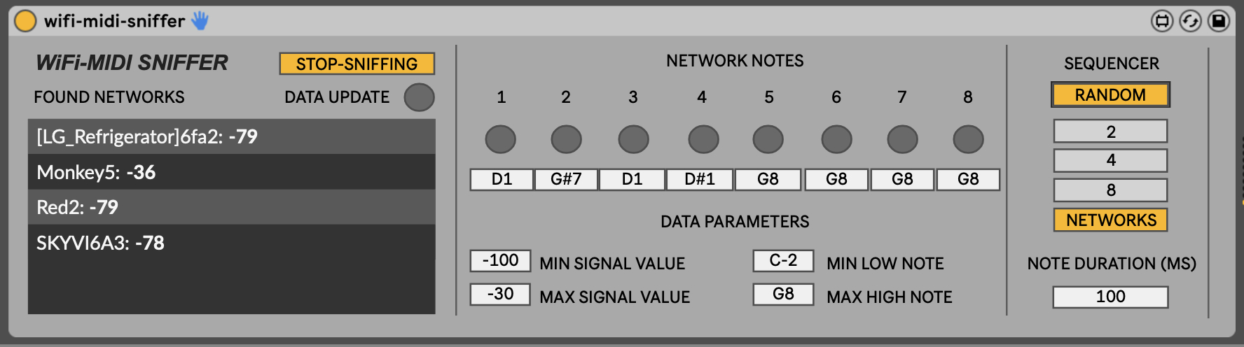| Description: | A M4L device which sonifies scanned WiFi RSSI values. The RSSI values of the scanned and collected wifi networks are mapped to MIDI note values and played through a basic sequencer with various controls. Tempo can be controlled through the main transport and the MIDI note values fluctuate as new RSSI values for the scanned wi-fi networks are returned by the system query. The device uses the Max shell external to execute the shell airport scan command in macOS only. The device enables the generation of evolving musical output from ambient wifi data. Video demo here: https://vimeo.com/867980974 Instructions (this is currently for MacOS only I'm afraid): 1. Add the device to a MIDI track 2. Press 'Start Sniffing' 3. Wait for any found networks to start showing up - this can take a minute or so (wifi will need to be turned on) 4. Press play in Ableton's main transport 5. Send the MIDI output from the track with WiFi-MIDI Sniffer on to another track with a MIDI instrument, or do something else with it... Please feedback via comments below. |
