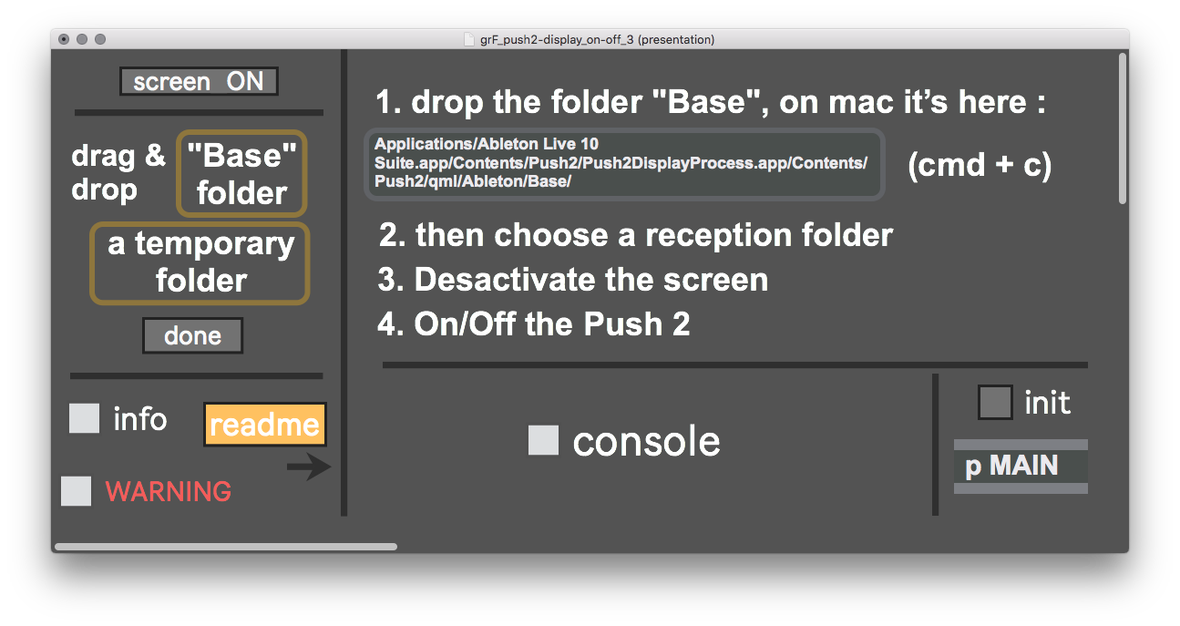 | Description: | The purpose of this patch is to kill the screen of the Push 2 to gain CPU ressources while replacing it witch a tablet/phone solution (Lemur, TouchOSC…) When you use you’re push while monitoring you’re CPU usages, you can see that "Push2DisplayProcess.app" (on mac) is using some ressources. The patch is moving a folder called "Base" (which is inside the Push2DisplayProcess) out of the Live folder structure to prevent the app to start as we plug the push. when you want to use it again, it put it back to it’s orginal place I’m not using imp.push because it seems that it work only if the push is not used as Control Surface (in the midi live preference) So if you still want to native function of the Push 2 without losting some ressource because of the screen, use this device thanks a lots to @borrierulez that suggested me this approche (via the Max discord !) I’ve tried it only on Mac for the moment. If you have questions, probleme, or suggestion about the patch, don’t hesitate |