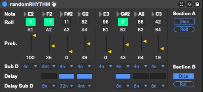 | Description: | randomRHYTHM is a recreation of a hardware module of the same name, without Swing, and with slightly expanded controls. There are two rhythm sections, A and B. The two sections contain four channels each. Each channel contains a slider that sets the probability that the note will be triggered and a subdivision amount. Channels 2, 3, and 4, on both rhythm sections can be independently delayed by a specified subdivision amount. DICE MODE Turn on Dice mode for each section and press the Roll button for a predefined set of random numbers that each channel will independently cycle through at the pace of the selected subdivision. The number of random numbers generated for each channel depends on the number of beats per measure. If you're in 4/4, then 4 random numbers will be generated for each channel. If you're in 11/4, 11 random numbers are generated for each channel, etc. |