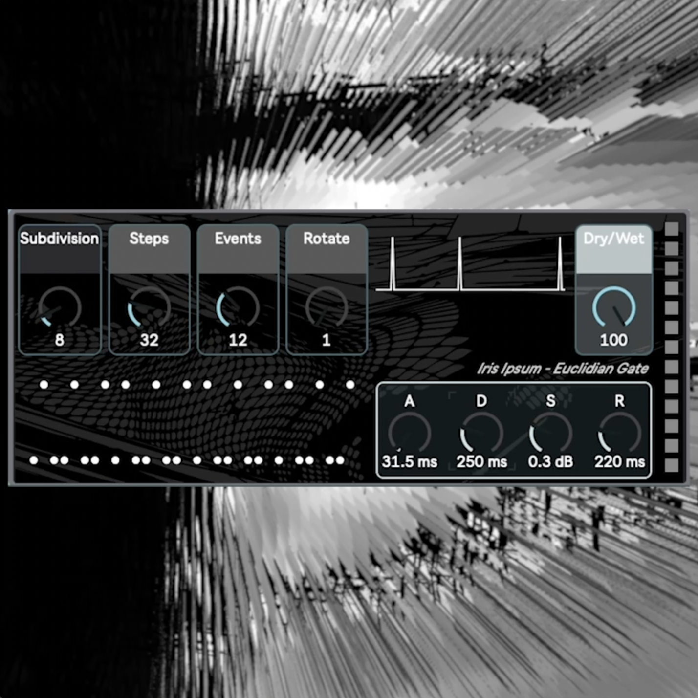 | Description: | Euclidian Gate is a gate sequencer audio effect based on the Euclidian algorithm, a mathematical method for generating patterns that are evenly distributed across a specified number of steps. The Subdivision parameter controls the division of sequencer pulses in relation to one measure of time, Steps determines the total number of steps in the Euclidian sequence, and Events specifies how many events (hits or triggers) are distributed across the steps. The Rotate parameter shifts the position of the pattern within the sequence, and the grey squares on the right side of the device can be used for storing and recalling presets. Shift clicking a box will store a preset, and clicking will recall a preset. Available for free download/pay what you want on Gumroad |