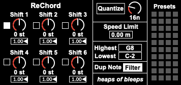 | Description: | This MIDI device is a modification of Ableton’s Chord device, which allows you to play chords by only pressing one key. It’s basically a mix between the Chord device and my Repitch device, thus ReChord. When you turn the pitch knobs to change the chord, or turn the toggles for each pitch on or off, this device immediately changes the chord you’re holding to the new chord. Making it a lot more modulatable. You can automate the knobs and toggles to play more dynamic moving chords with the press of one key. The device has the same velocity scaling that Ableton’s Chord device has, allowing you to control the velocity of each pitch of the chord separately. It has the same quantize function as Repitch, which allows you to only change to the chord on the beat division you specify. And a speed limiter which limits the speed that the chord can change. Also there’s a Duplicate Note Filter, which will filter out duplicate note offs that can occur when using this device polyphonically. For example, if one of the pitch knobs is set to +4 and you play a C3 and an E3, and then let go of the E3 before the C3, the E3 that is held from your C3 (C3 + 4) will still hold. This makes sure your chords still hold the way you want them to when the device is played polyphonically. This device is great at making complex music, without having to meticulous input your chord changes. Just automate or modulate them instead! Special thanks to Nathan Turczan for the idea. He has his own MIDI plugin Scale Navigator that you shuold check out: https://www.scalenavigator.com/ |