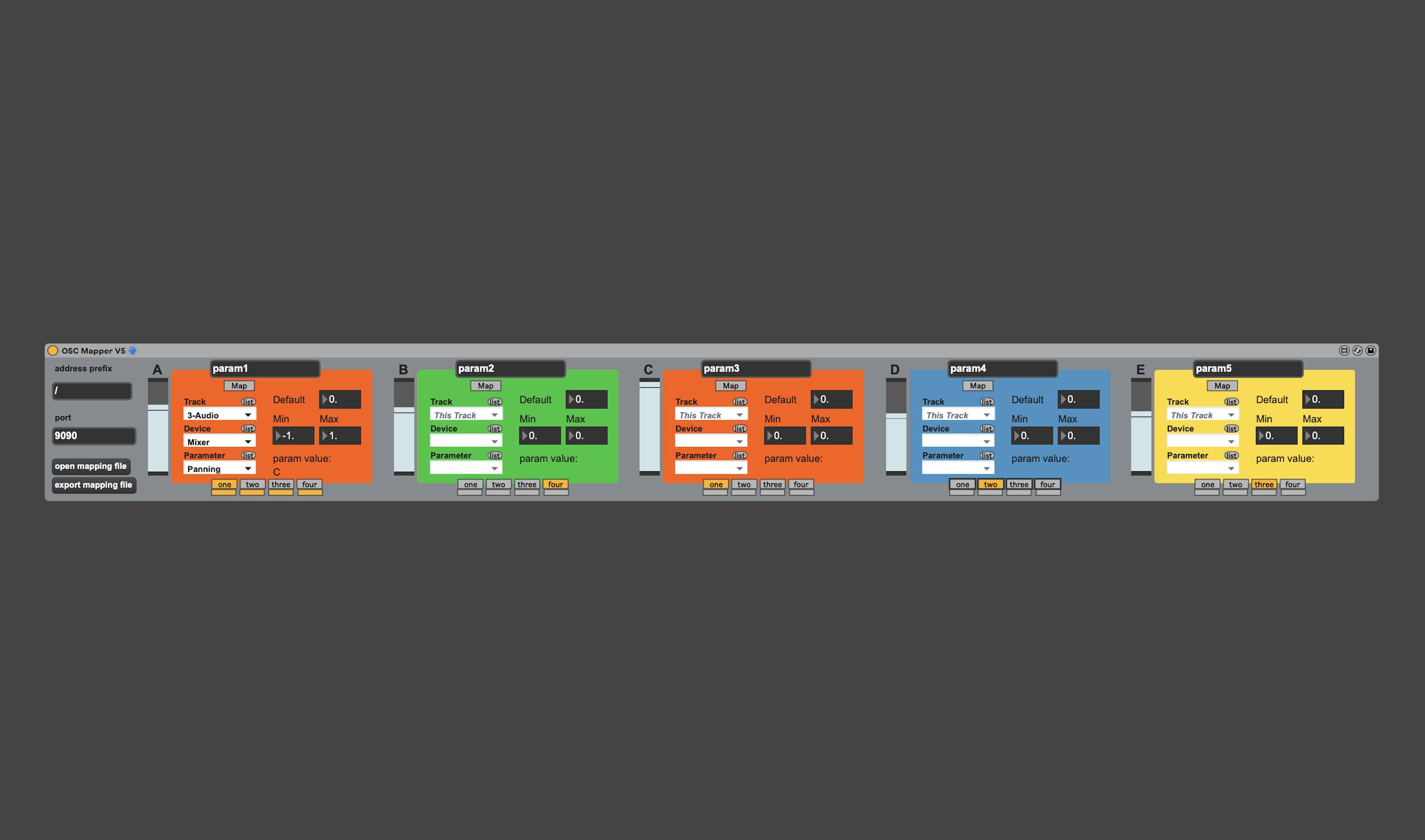 A free OSC receiver that maps OSC parameters to Ableton Live. OSC Mapper's 5 OSC parameters can each be mapped to 4 of Live's parameters simultaneously, with a settable range for each. Each Live parameter can also have a "default" value that is settable and callable via a "reset" OSC message. |