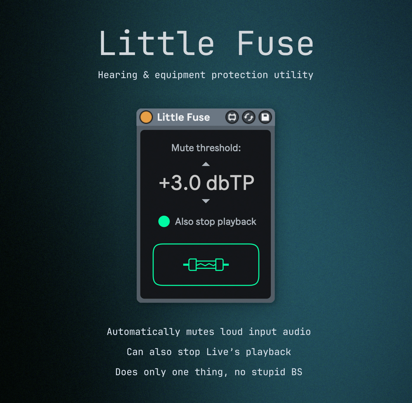 | Description: | Little Fuse v1.0 - Hearing and equipment protection utility. Just put it on a master track and set the maximum allowed volume level. If the input volume exceeds the desired threshold, the audio will be automatically muted, and (optionally) Live's playback will be stopped. When triggered, it displays a handy alert window that allows to instantly re-enable protection and unmute audio, without switching tracks and finding the device. If you found a bug or have an idea for further improvements, please leave a comment :) -- Moi Ochi |