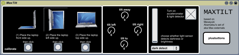 | Description: | MaxTilt accesses the built-in accelerometer featured in all Macbooks made after 2005 and outputs MIDI messages based on X & Y orientation. It also accesses the light sensor beside the webcam and outputs MIDI messages. Video Demo: http://youtu.be/KjcykY3v6D4 ---------------SETUP---------------- 1. Download the aka.booklight & aka.bookmotion max externals from here: http://www.iamas.ac.jp/~aka/max/ 2. Unzip and copy the .mxo and .help files to the 'externals' folder within MaxMsp (for me this was applications>Max5>Externals. You may have to create this folder if it doesn't exist already. Ensure this directory is within the searchable MaxMsp filepath by opening Max, and clicking options>file preferences, pressing the + button to create a new path called 'Externals' and selecting the folder path you had just created). ---------------------MIDI SETUP----------------- 1. Open 'Audio MIDI Setup' 2. In the toolbar select 'Window' -> 'Show MIDI Window' 3. Double Click on IAC Driver 4. Make sure 'Device is online' is checked 5. Click on + to add a port. 6. Rename this port something like 'MaxTilt' -------------ABLETON------------ 1. In preferences go to the MIDI Sync tab. 2. Ensure that Track & Remote for the Input of your new virtual MaxTilt port are active 3. For the virtual MaxTilt output port make sure only the Track is activated. 4. Drag the MaxTilt device to a new MIDI track 5. With the I/O settings for the new MIDI track, set its MIDI output to the new virtual MaxTilt port you created, and any MIDI channel you prefer. --------------CALIBRATION----------------- 1. Position your laptop in the orientations shown in the three pictures and press the corresponding buttons when in each position. -----------------MIDI MAPPING------------ 1. Hit the MIDI map button in ableton. 2. Select the parameter you wish to control. 3. Move your laptop in the direction you want to control the parameter (or shine a light/cover the light sensor.) *note; you must move the laptop in one pure direction, i.e. hard left/hard right, straight up/straight down. If you lift the back right of your laptop in the air for example you will be outputting two midi messages simultaneously and ableton will not know which to midi map. -------------------------------------------- The MaxTilt device should then be fully calibrated and midi-mapped and you should be able to control any filters or reverb sends like a wizard. This Max4Live device uses two externals made by Masayuki Akamatsu. Inspired by the awesome Altitude Sickness' SmackTop. plusbuttons.tumblr.com STANDALONE MAX RUNTIME VERSION AVAILABLE HERE: http://post.monome.org/comments.php?DiscussionID=13812 ***version 1.1 Embedded pictures into patch ***version 1.2 changed instructions, changed midi mapping mode |