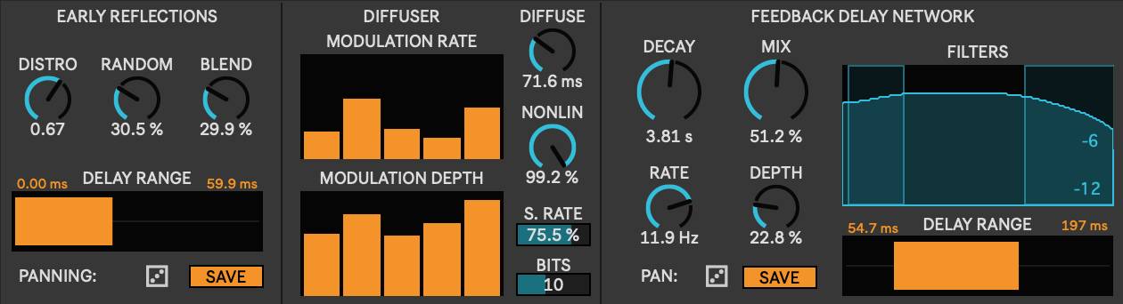| Description: | This is a versatile FDN inspired by Geraint Luff's talk and blogpost. The reverb is comprised of a serial diffuser network feeding into a feedback delay network. Both are 8 channels and support random modulation. The 5-stage diffuser supports separate modulation rates and depths for each stage. The early reflections are 20 channels taken from pick-off points before and throughout the diffuser network. Non-linearities can be introduces by using the bitcrusher or by driving saturation functions within the diffuser. This reverb exposes a lot of parameters which makes it extremely flexible, but not as quick to dial in a sound. Many combinations may be too wild for practical or realistic usage, but there are many sweet spots. This approach does allow a deeper understanding of what is happening under the hood. I am still figuring out what delay line ranges are best for what application, so perhaps I will make a more tuned reverb in the future. The range sliders can be controlled by holding modifier keys (shift, command/control, option/alt) while click-dragging the slider. Blog Post: signalsmith-audio.co.uk/writing/2021/lets-write-a-reverb |