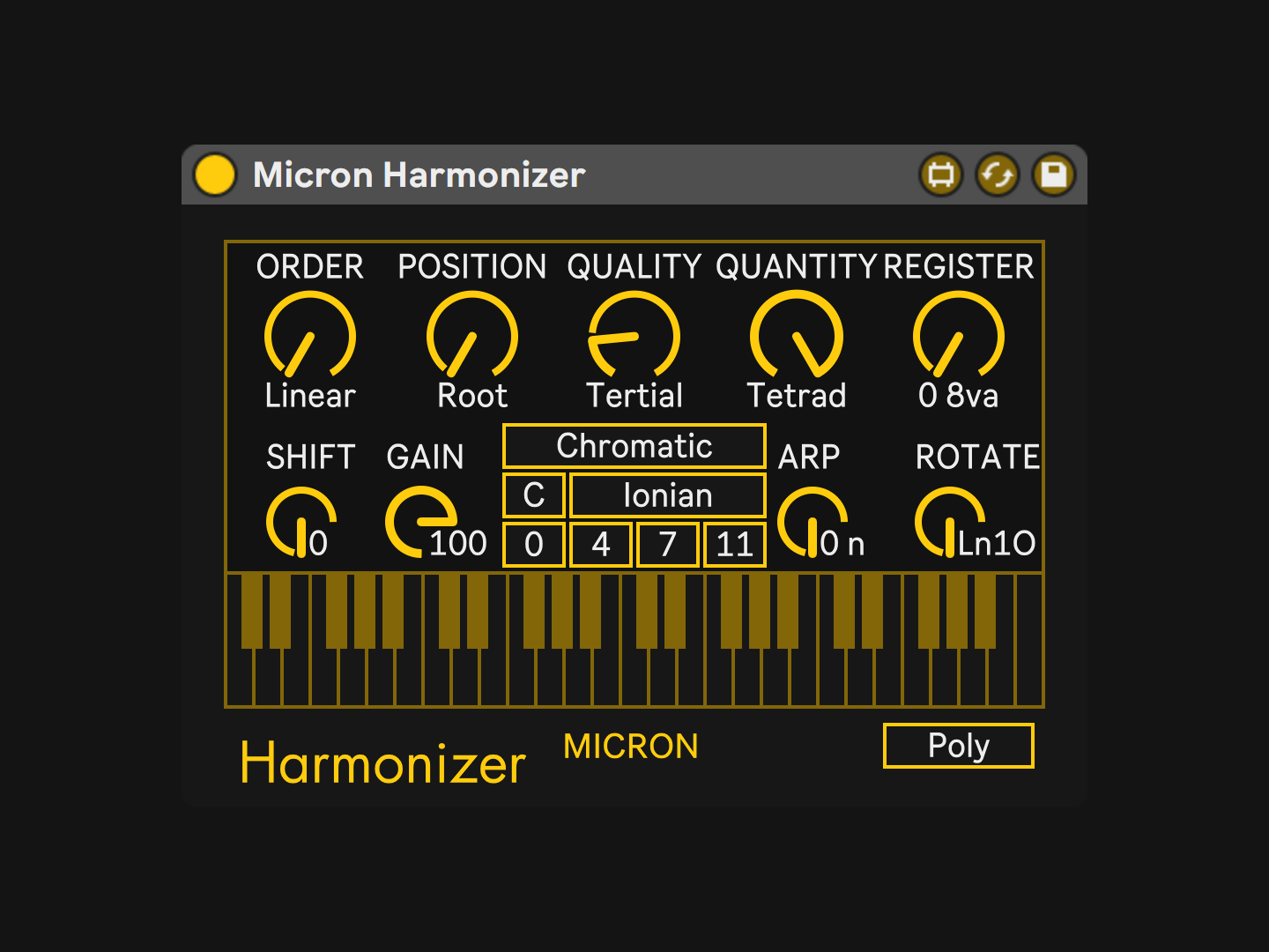 | Description: | Device included in Album purchase on Bandcamp Harmonizer is a MIDI effect that outputs up to four MIDI notes for every input note to create synchronized and arpeggiated harmony. The added notes are designed from the selected Pitch set based on the input note, which is the root of each chord, and the selected parameters. QUANTITY selects the amount of pitches in the Pitch set, and its permutations are created by using ORDER, POSITION, and QUALITY. ORDER selects the arrangement of the Pitch set. POSITION selects the rotation of the Pitch set from the selected ORDER. QUALITY selects the diatonic interval multiplied to the Pitch set from the selected ORDER and POSITION. In addition, REGISTER selects the amount of pitches, from the right, to be displaced upwards by an octave. This simply provides a larger spread between the notes without affecting its permutation. The middle block of this device contains the GENUS, KEY & MODE, and four PITCH boxes. GENUS switches between the 12-tone Chromatic scale (normalized at 0) with a static Pitch set and the 7-tone Diatonic scale (normalized at 1) with a dynamic Pitch set. KEY selects the starting pitch of the scale from the selected MODE and GENUS. MODE selects the chromatic alteration to the diatonic interval from the selected QUALITY. PITCH selects each individual Pitch integer within the set, which are only positive and normalized to the selected GENUS. Extra features include adjustments to MIDI input values and an arpeggiator. SOURCE switches MIDI inputs between Monophonic and Polyphonic. SHIFT increases the MIDI pitch value upwards from the input. GAIN decreases the MIDI velocity value downwards from the input. ARP selects the tempo-synched rate of arpeggiation (1/4 note - 1/128 note) or simultaneously (0 note) at the output. ROTATE selects the arpeggiation’s order (Linear, Angled, or Curved), position (1st, 2nd, 3rd, 4th), and direction (Obverse or Reverse). The keyboard displays the selected Pitch set in Pitch set class form. |