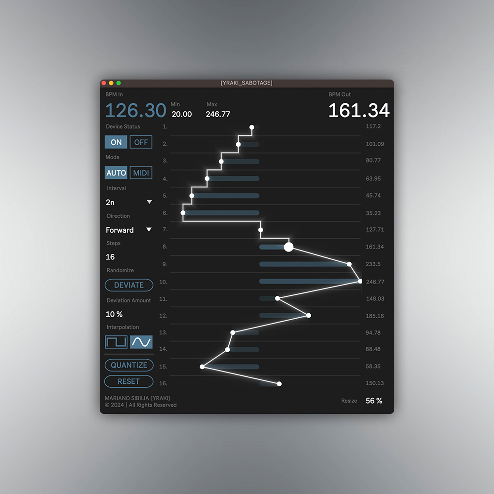 | Description: | SABOTAGE is a unique Max For Live device that redefines the role of master tempo in music production. While traditional sequencers are typically governed by a fixed master tempo, SABOTAGE is engineered to disrupt and transform that tempo, encouraging the exploration of less conventional methods and creative techniques. Demo Vid: https://youtu.be/iKApRsmRRAg?si=szizfMWQEAZhcpNQ However, it's important to use SABOTAGE carefully, as improper application could potentially destabilize (or "sabotage") your project. While automating master tempo in Ableton has been possible before, SABOTAGE expands this concept by providing more flexibility. It includes adjustable tempo ranges that allow for precise control over tempo shifts. Users can choose from two sequencing modes: AUTO, which syncs with Ableton's transport, and MIDI, which triggers tempo changes through incoming MIDI notes. Additionally, you can adjust the probability of tempo shifts and use features like deviation and interpolation for more refined and nuanced tempo changes. One of the device's unique features is its quantization mode. When enabled, this mode snaps tempo values to the closest musical division of the initial BPM. This ensures that tempo variations remain rhythmically coherent. In essence, SABOTAGE transforms the BPM from a fixed parameter into a flexible, evolving element. It’s like producing on the grid - but with a grid that’s constantly morphing. Hope you enjoy it x IG: https://www.instagram.com/y.r.a.k.i SC: https://soundcloud.com/yraki TW: https://twitter.com/yraki_music |