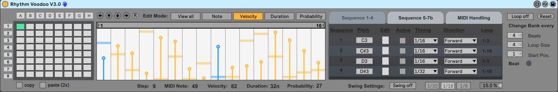 | Description: | ------------------ Rhythm Voodoo V3.0 ------------------ (DEC 2020) Drum Machine Sequencer based on Max4Live's SimpleStepSequencer. -------- Features -------- - 64x pattern bank. Patterns are stored each time another bank slot is called(!). - 8 up to 16 step sequences simultaneously. Set a unique pitch for each sequence. Drive by velocity. - Loop unit added. Make Banks switch automatically if needed, by toggling the "Loop on/off" button. - (Version 3.0) Midi In can be used to switch the patterns directly, e.g. by sending a Note-On event in the current track. Notes starting from C-0.. toggle the patterns (banks) 1 - 64. Happy patching! H. Haerer |