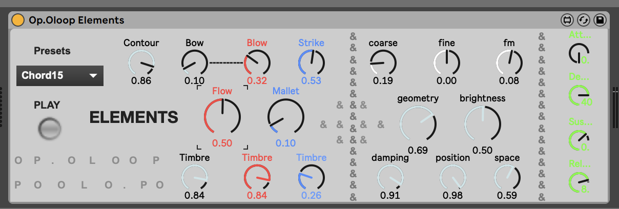 | Description: | Elements is a cryptic module originally designed by Emilié Guillet at Mutable Instruments. Since it is a Eurorack module, it does not show all his potential as a synthesizer. We take care to make 100 presets to show a bit of all this module has to bring. It can sound very smooth and delicate, or it can be a beast of modal synths. Feel free to explore with Ableton's LFOs to tweak every sound; you will be surprised many times. This device has 4 voices of polyphony. All our love to Emilié Guillet for her contribution in the audio world!!! See: https://youtu.be/0OTdx2iuXwY |