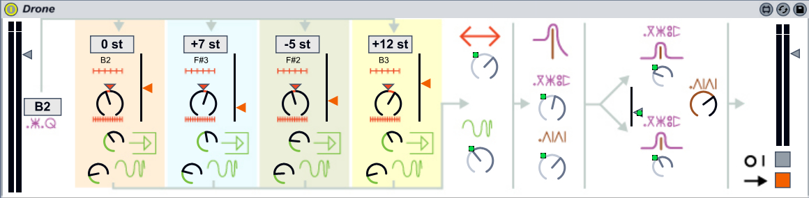 It is an ALP Live Project file which contains some examples of the synths playing, and then the drone piece featured in the video. (We used reverb and some phaser too I believe.)