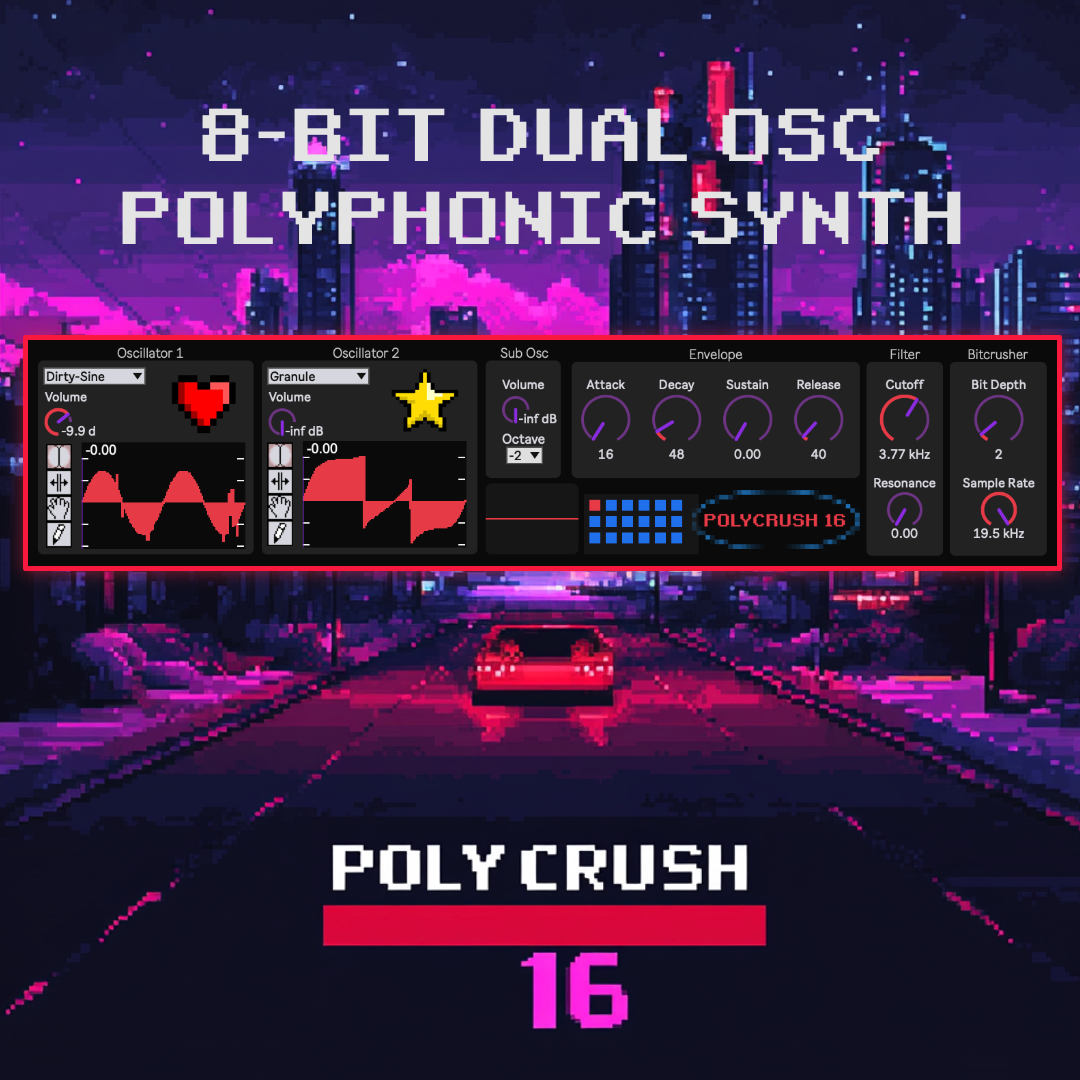 Description: Polycrush 16 is a polyphonic synthesizer inspired by the old 8-bit sounds from retro video game systems of the 80s and 90s. It offers two oscillators as well as a third sub oscillator. Each oscillator has sixteen wave shapes to choose from. From there, you have typical ADSR control over your sound, followed by a bit crusher to make sounds even more lo-fi.