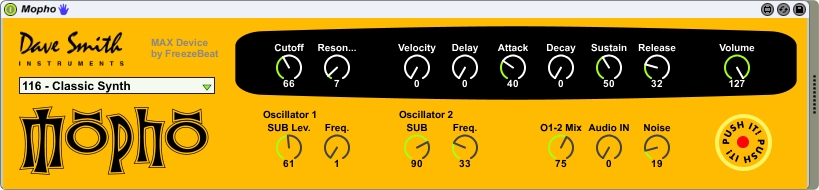 | Description: | V1.0 - Change programs ( 3 factory banks ) - Change most common controls. v1.1 update ========= If a control value is set to zero the Mopho will not be updated. In Version 1.0 this was the case, which causes all controls values where set to 0, if a liveset was reopened. In version 1.1 the choosen value will be sent to the Mopho minus 1, so 1 becomes 0 and 100 becomes 99 and so on.. |
