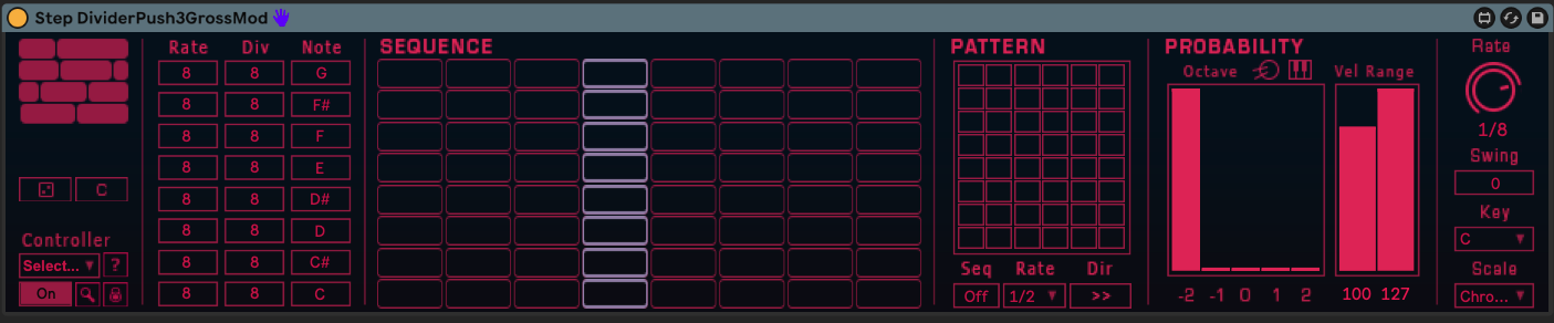 Also probably obvious, left-hand button above the Push display (StepDividerP) gives you access to Global, Probability, Rate, Division and Note control.
