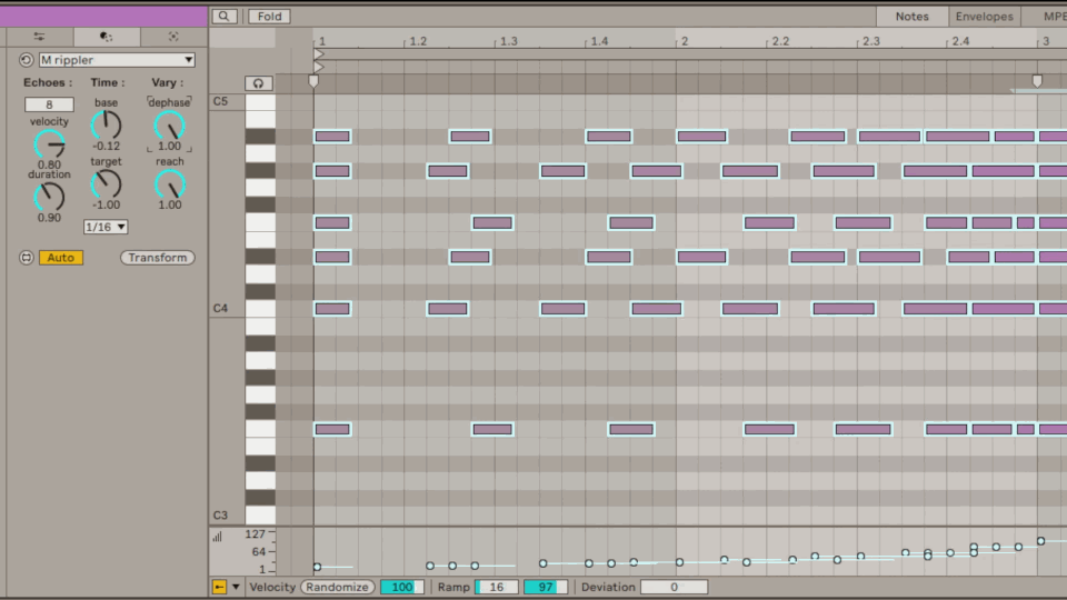 | Description: | MIDI delay (transformation) with some experimental options allowing for : - negative time delay - per-note dephasing - synchronized end-of-tails - progressive speed change - quantization - change of duration or velocity over time latest updates : 2025 03 30 > fixed bugs due to the use of global sends |