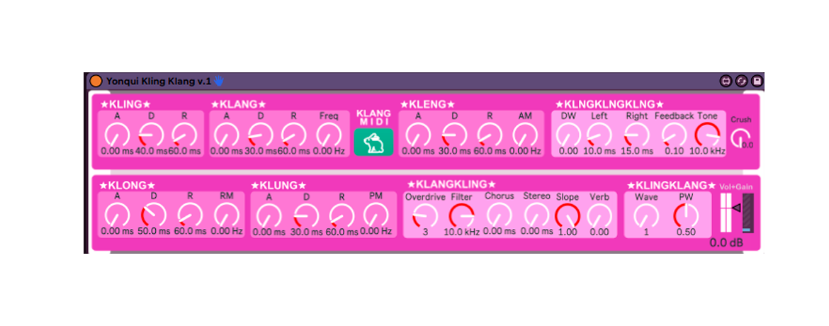 | Description: | Yonqui Kling Klang v.1 is a Max For Live monophonic synthesizer made for percussive and metallic sounds. It includes a main source with 4 selectable waves that works with MIDI input and a second one with a pulse wave that you can use with a fixed frequency or change to be able to work with MIDI input using the green bunny button. The synth has Ring Modulation, Amplitude Modulation and Phase Modulation, each with its dedicated envelope. A dedicated delay module is also include, plus an effects module with overdrive, filter, chorus, stereo widener and reverb. There's also a slope know, which controls the slope of all envelopes. In the top right corner there's a little knob for bitcrushing. Finally, there's the volume and gain sliders. The output is limited, so you can go bonkers with this synth. As a freebie, the Yonqui Midi Mangler is included. It sets automatically the velocity to random values with a selectable range and also lets you change the pitch of the MIDI input to two octaves above or belows. The last knob is the probability knob that gates MIDI input. If it at 50%, half of them will go through, if it's 100% all will, if 0%, none. |