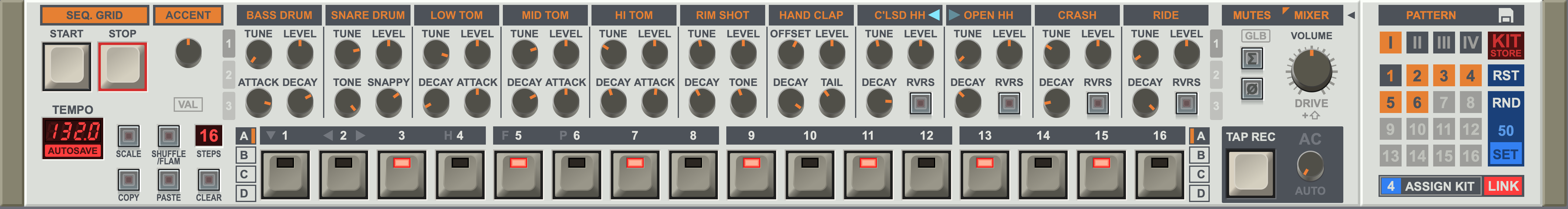 | Description: | **TR-909 Inspired Max for Live Drum Machine – Live-Optimized, Coded from the Ground Up** This is not just another drum sample player – this is a fully programmable, live-focused recreation of the TR-909 in Max for Live, combining analog-style synthesis with performance-first sequencing. Built entirely with Max/MSP (instruments coded in gen~), this device offers a deep and dynamic 909-style sound, including: **Sound Engine** - All voices (except hats/cymbals) fully generated using **gen~** - **Hi-hats and cymbals** read directly from original Roland 909 **EEPROM data** - Authentic **TR-909 shuffle**, **flams**, and **accent** behavior – applied to both internal and MIDI-Out - **Track probability** per step for evolving grooves - **6 assignable group outputs** + master channel with analog-style **saturation/distortion** - Individual **track lengths** up to 64 steps --- **Sequencer & Performance Features** - Built-in **step sequencer** with true 909 workflow - **Instant pattern switching**, **instant kit switching**, assign kits per pattern - **Flam depth**, **velocity accent**, **track probability** all affect **MIDI Out** as well - Fully **MIDI-controllable** (remote control via external gear or controllers) - **Mute/solo functions**, **mute groups**, and **live-oriented layout** – perfect for on-stage performance - Clean, minimal interface – no distractions, just tools --- **Watch the demo video** https://youtu.be/Eqan7qB6xic **Buy now on Gumroad** https://nukemodular.gumroad.com/l/soack |