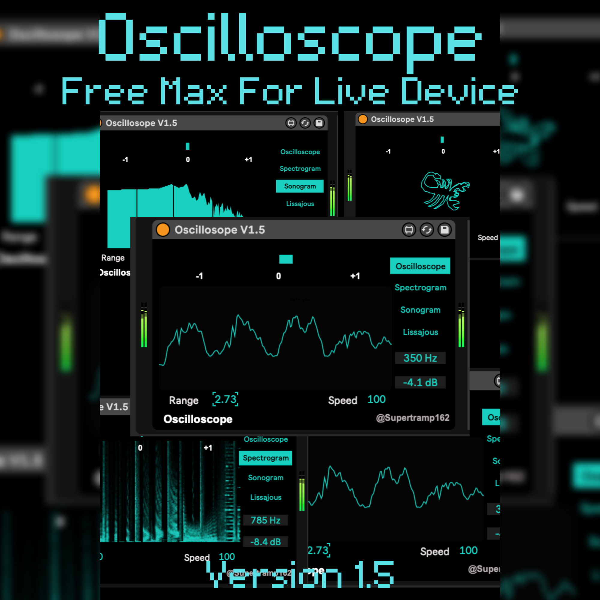 | Description: | Oscilloscope is a Max for Live device designed for Ableton Live by Stephen Black, to visualise and analyse audio signals. It provides visual feedback of audio waveforms, allowing users to observe the shape and dynamics of their sound signals in real-time. Updates include a phase correlation meter and a Lissajousas to further display visual representations of audio with the Oscilloscope, Sonogram and Spectroscope modes. If you like my work and wish to collaborate or contact me, the best place to do so is through my instagram @supertramp162. https://linktr.ee/supertramp162 |