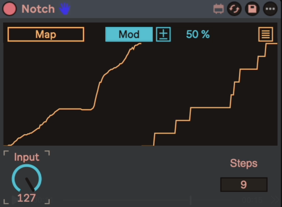 | Description: | Notch turns continuous waveforms into stepped ones. This modulator is based on the ER301 grid quantizer unit, which I've always wanted to have in other formats but have never come across elsewhere. You feed the input any other modulation (or just control from a midi fader etc) and set the number of desired 'notches' in the output from 2 to 16. These notches are placed evenly across the height of the output. With steps set at 2, you will get a low/high (off/on) control, i.e. a square wave. Higher step counts produce more notches, but you will always get minimum and maximum values at the extremes of the input. Some basic ideas for usage: - Creating detents in continuous controls, useful for mixing applications where you might want to restrict your possible choices. - Creating crude presets across a continuous control, useful in performance when you want to reliably catch only a handful of positions across the throw of a dial. - My favorite usage is to follow this type of modulator with a slew limiter. This way you can snap to given positions on a control, but with smooth interpolation between each position. Consider using Notch in combination with Spaghetti, my slew device. This patch makes use of Zack Steinkamp's zs.mapper abstraction and is therefore licensed under the GPLv3: https://github.com/zsteinkamp/m4l-zs.mapper. Thank you to Zack! |