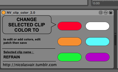 | Description: | Simple little device to change the color of the selected clip. You can map the buttons to keyboard. Compared to v1, in v2 you can super easily change and add colors (max is 30 colors). I use it mainly when tracking, using the following color code : red -> Bad take orange -> Ok take green -> Great take white -> time issue pink -> something else to be taken care of blue -> pitch issue You can easily open the patch to change colors or add colors. Note : currently it doesn't work on a selection of various clips. It's a real bummer for linked tracks (current workaround is right click and select color). Find my other devices here https://nicolasvair.tumblr.com/post/733477909092810752/max-4-live-devices |