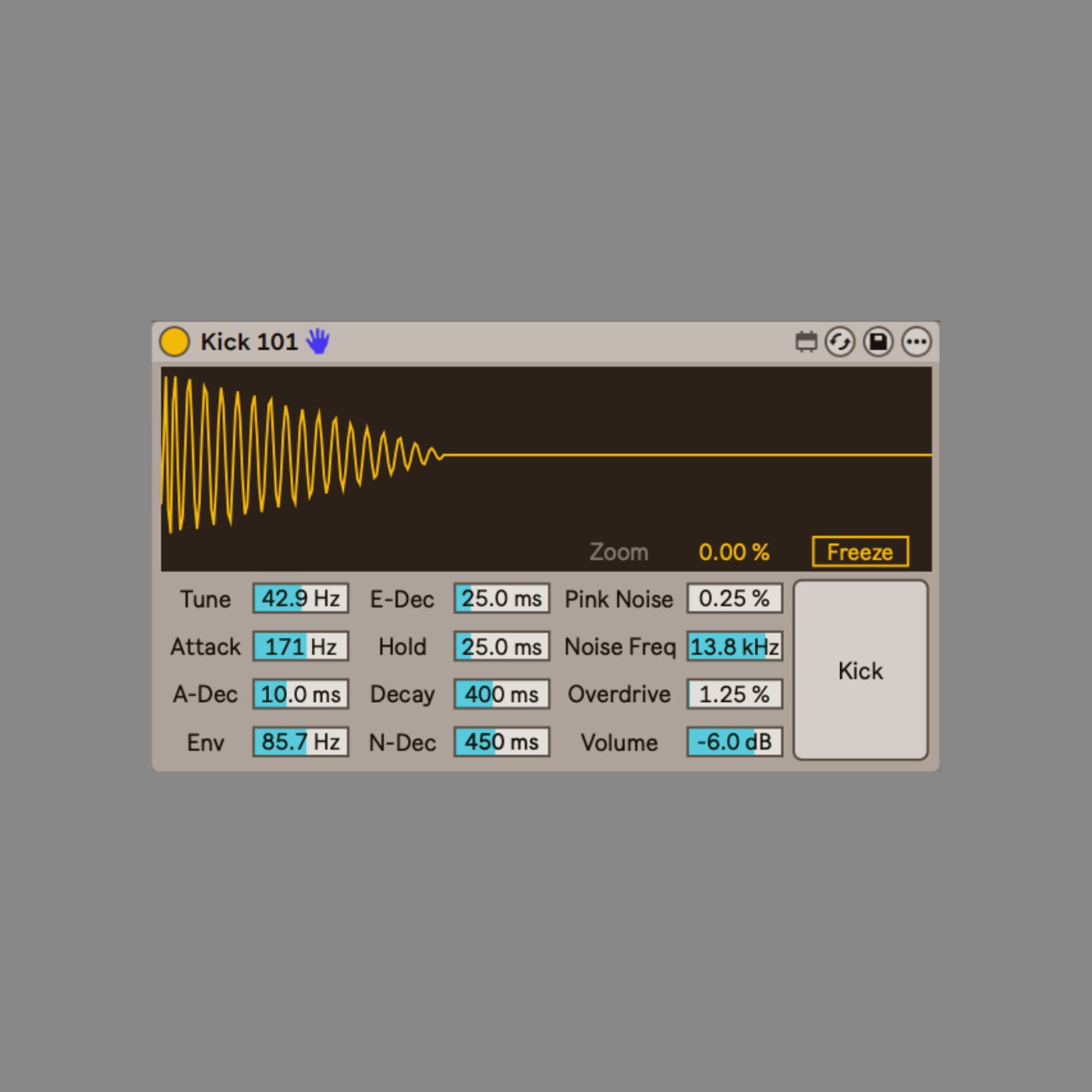 | Description: | Kick 101 — a kick drum synthesizer, an updated take on Telefon Tel Aviv’s Max For Live device "Kickdrum 101". New UI, expanded the main pitch range, made the attack/initial pitch tunable, extended the initial pitch, punch, and main decay times, added adjustable noise decay with a wider frequency range, increased the overdrive range, added a volume control, introduced waveform zoom, and added a freeze button. Ableton blog article: https://www.ableton.com/en/blog/telefon-tel-aviv-shifting-time/ |