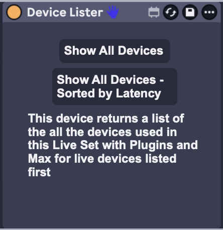 | Description: | This device uses Javascript to open a window and list all the devices used in this Live Set. It lists all 3rd party plugins and Max for Live devices first. It can be useful when preparing sets for Push 3 Standalone to find any plugins you may want to replace in a set. I'm using the v8 oject so this requires Max 9. 1.2 Updated the device to support longer lists of devices and to allow you to save the list as a text file 1.1 updated to include an option to display the latency of each device and to sort by the amount of latency. |