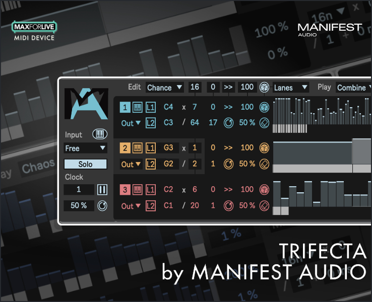| Description: | MODULAR POLYRHYTHM AND MELODIC CHANCE FOR GENERATIVE SEQUENCING Trifecta by MANIFEST AUDIO is a modular Max for Live MIDI sequencer and arpeggiator for creating rich, polyrhythmic, polymetric, and generative musical structures. With three independent strands of dual-MIDI note output, each with seven parameter lanes and multiple modes to interweave them, Trifecta enables detailed control, wild experimentation, and everything in between. Key Features: - 3 independent dual-note strands with 7 parameter lanes each: Gate, Notes, Velocity, Chance, Length, CC, Delay - Dynamic Combine, Converse, Count, and Chaos playback modes - Per-lane Euclidean sequencing, randomization, and cycle lengths - Meticulous arpeggiation control with input-based note learning, and visual feedback - Route each strand to the current track or anywhere else in your set with the included X-Relay utility - Instant Drums mode toggle when working Drum Racks - Mono/Poly playback options along with Gate and Side modes playback modes - Global and local transposition, delay, and clock settings - Scale Aware and Push Standalone compatible - Includes bonus Utility Boost pack with 8 Max for Live utilities Discover structured unpredictability with Trifecta. |